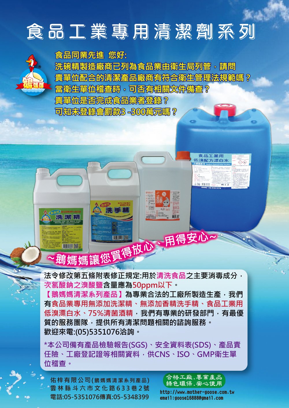 - 適用:食品加工廠、生鮮處理廠、餐飲、團膳、餐廳等機台器具碗盤清洗及環境地板清潔,高生物分解度,適用於具生物廢水處理設備之場所使用。
