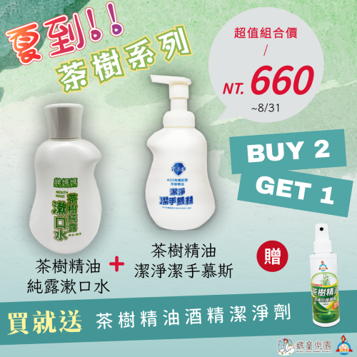 鵝媽媽茶樹系列※不適用賣場滿千免運(茶樹精油潔淨潔手慕絲【500cc】+茶樹純露漱口水【300ml】+茶樹精油酒精潔淨劑 【100ml】)